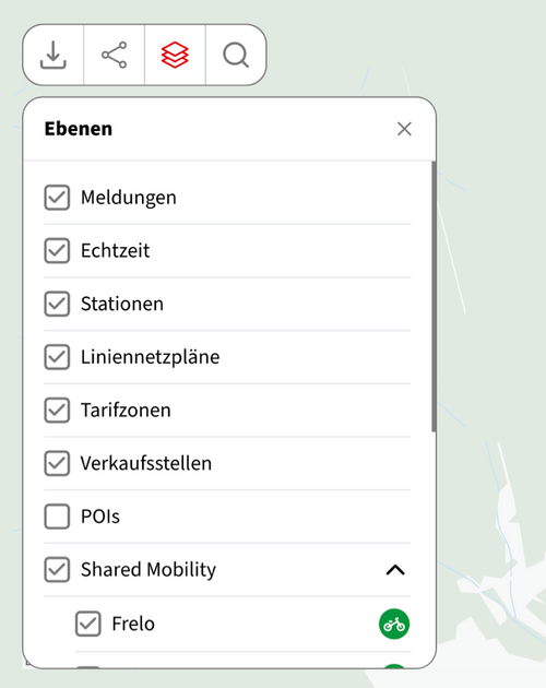 Auf der Karte findest du nicht nur Busse und Bahnen, sondern auch die Verfügbarkeit von Sharing- Fahrzeugen aller Anbieter in der Übersicht.