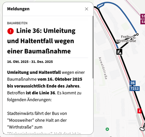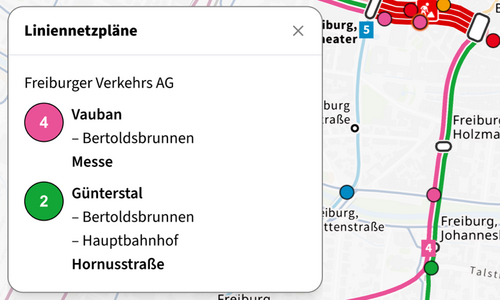 Mit Klick auf eine Linie wird diese hervorgehoben und der Fahrtverlauf mit Start- und Endhaltestelle in der Übersicht angezeigt. Bei Klick auf Haltestellen werden die dort verkehrenden Linien angezeigt.
