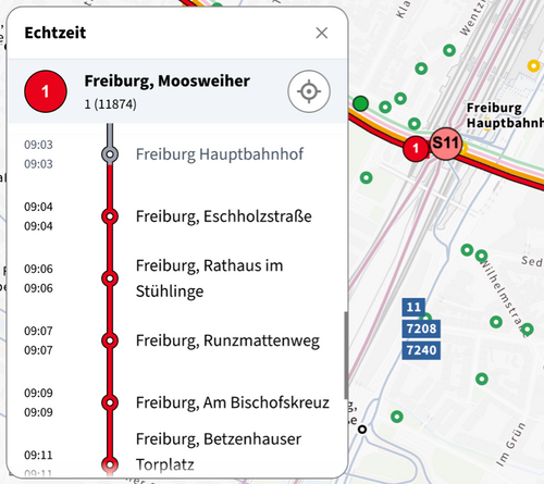 Mit Klick auf ein Fahrzeug erhältst du eine Linienübersicht, inklusive der Ansicht der nächsten Haltestellen. Nutze das Ziel-Icon um den Fahrtverlauf eines Fahrzeug (z.B. in dem du gerade bist) zu verfolgen.