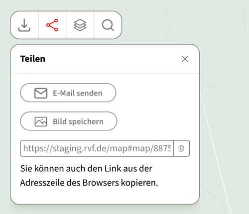 Teile den Ausschnitt der Karte per E-Mail oder speichere ein Bild. Alternativ kannst du den Link zum Kartenausschnitt kopieren um ihn in einer beliebigen App einzufügen.